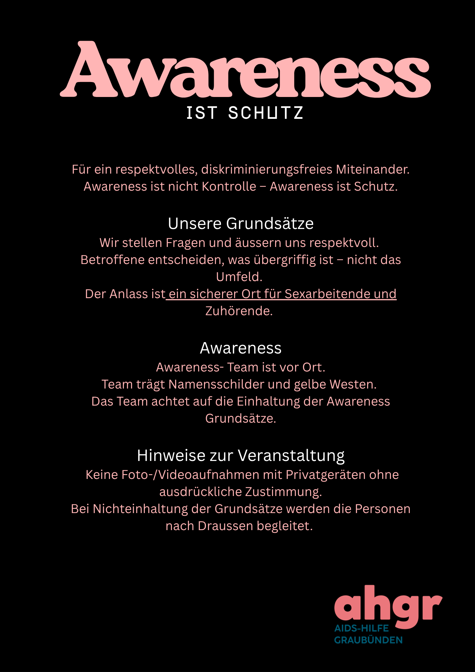 Moderiert von der Aids-Hilfe Graubünden und es besteht für die Veranstaltung ein Awarenesskonzept.